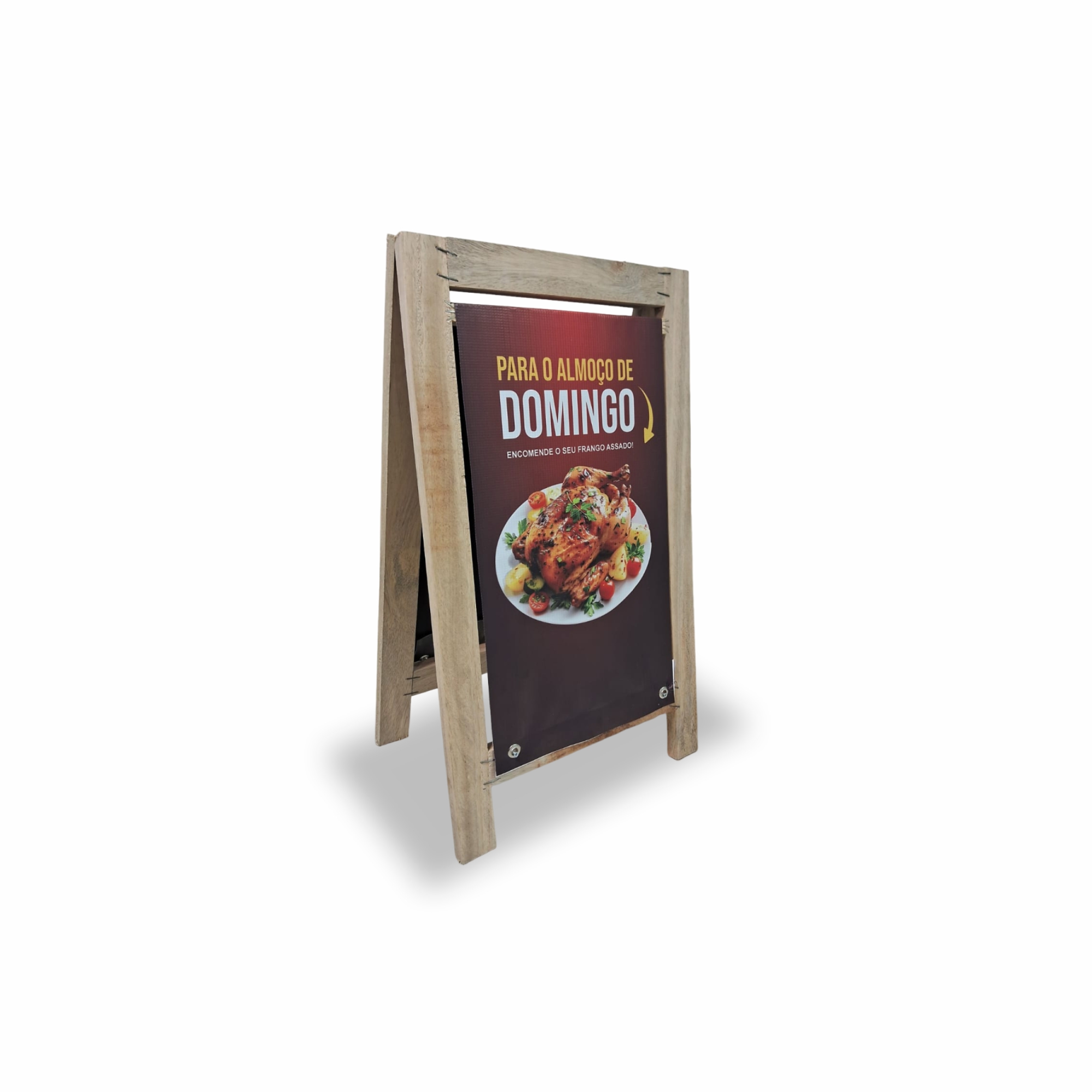 Produzido com estrutura em madeira de alta qualidade, ele garante durabilidade e estabilidade, sendo perfeito para uso interno ou externo. O grande diferencial está na sua lona substituível: você pode trocar a arte sempre que quiser, sem danificar o cavalete, mantendo sua comunicação sempre atualizada e profissional.